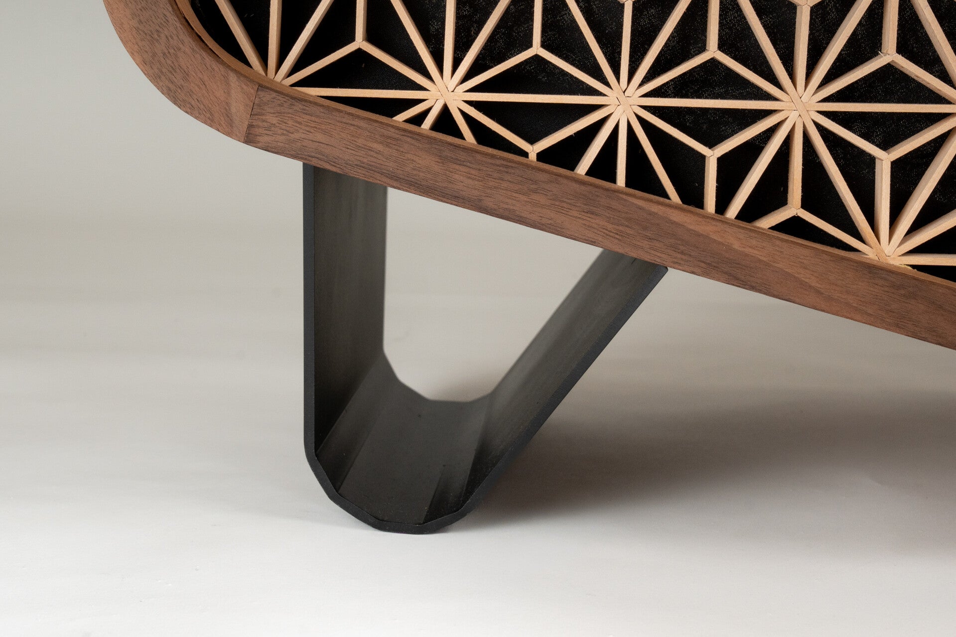 Het front van het meubel is gemaakt met een traditionele Japanse houttechniek, ook wel kumiko genoemd. Hierbij worden verfijnde houten patronen volledig met de hand samengesteld, zonder zichtbare bevestigingen.