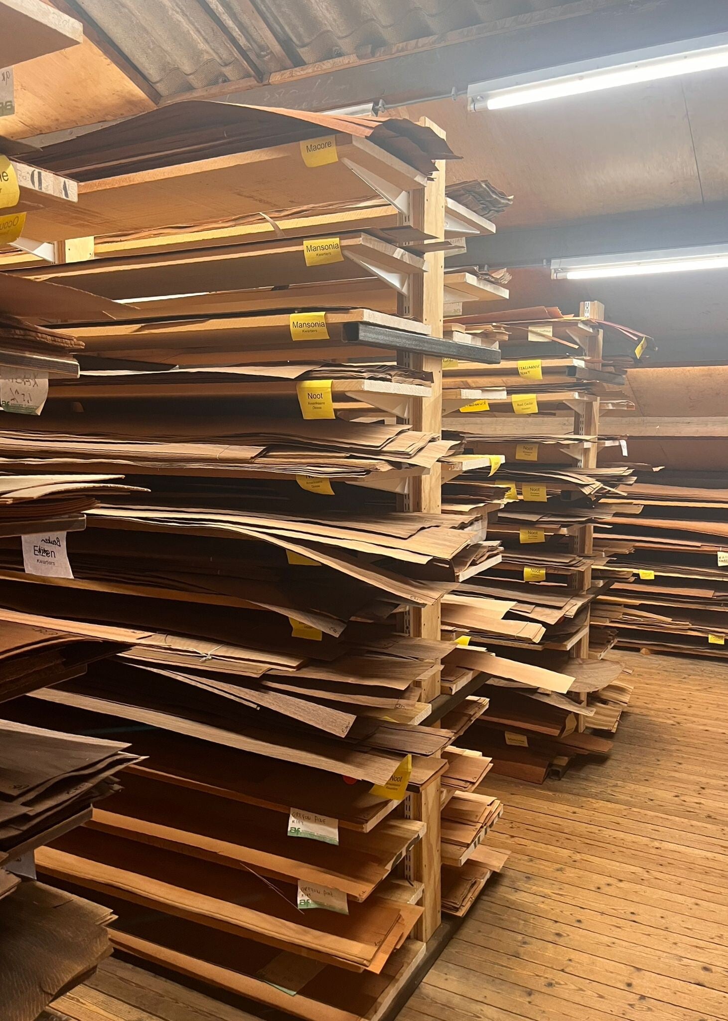 Afrormosia, Afzelia, Aniegré, Avodiré, Bamboe, Berken, Beuken blank, Beuken gestoomd, Bubinga, Ceder Loofhout, Citroen, Coromandel, Eiken Amerikaans, Eiken 'gerookt', Eiken genoest, Eiken Europees, Elzen, Esdoorn, Esdoorn gemoest, Esdoorn riegel, Essen blank, Essen, olijf, Grand Bassam, Grenen Amerikaans, Iepen Amerikaans grijs, Iepen Europees rood, Iroko, Ipé – Groenhart, Jatoba, Kersen, Mahonie Afrikaans, Mahonie Cuba, Mahonie Honduras, Mahonie figured, Mahonie Pommelé, Makoré, Mansonia, Noten Amerikaans, Noten Europees, Noten figured, Okoumé, Olijf, Oregon Pine, Ovangkol, Padoek, Palissander Indisch, Palissander, Mexicaans, Palissander Rio, Palissander Santos, Paldao, Pau ferro, Pau rosa, Plataan, Purperhart, Peren gestoomd, Red Cedar, Rozen, Teak, Taxus, Tulpen, Wengé, Zebrano, Ziricote